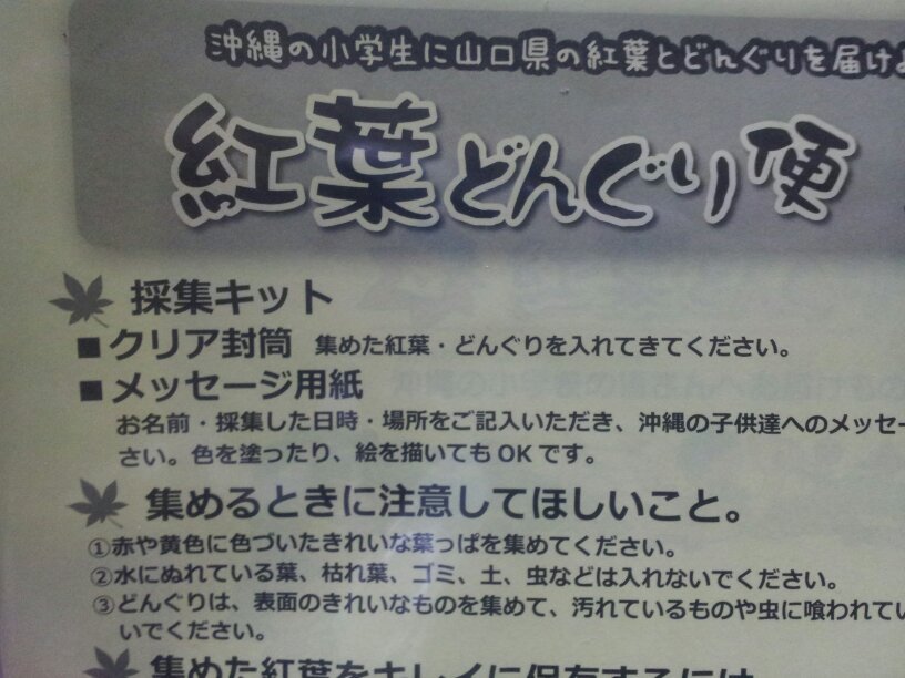 山口県防府市にあるコミュニティFM、「FMわっしょい」が、沖縄の小学生に山口県の紅葉とどんぐりを送ろう、